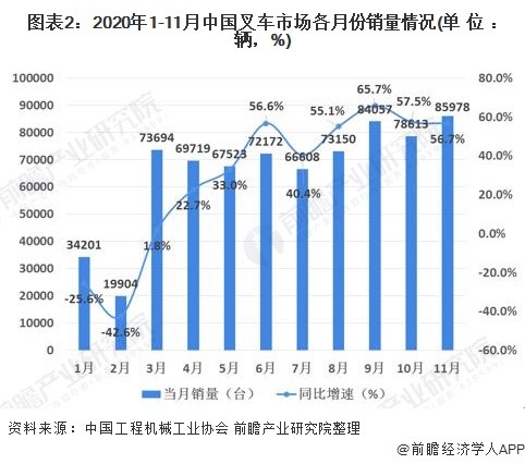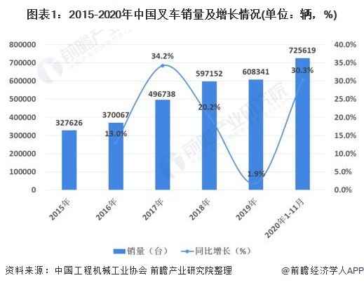 2020年受益于國(guó)內(nèi)新冠疫情得到迅速控制,國(guó)內(nèi)制造業(yè)、物流業(yè)的快速恢復(fù),叉車(chē)市場(chǎng)需求快速增長(zhǎng)。2020年1-11月份的累計(jì)銷(xiāo)量達(dá)到72.56萬(wàn)輛,與2019年同期相比增長(zhǎng)30.3%。