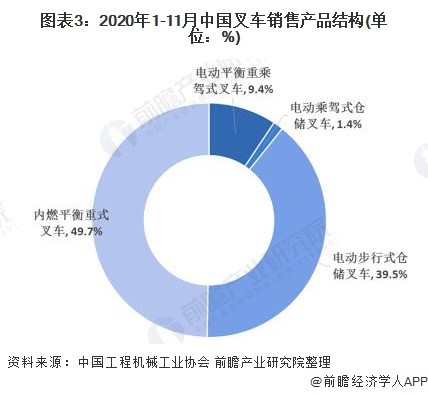 叉車(chē)主要分為四類,包括內(nèi)燃平衡重式叉車(chē)、電動(dòng)平衡重叉車(chē)、電動(dòng)乘駕式倉(cāng)儲(chǔ)叉車(chē)、電動(dòng)步行式倉(cāng)儲(chǔ)叉車(chē),分別對(duì)應(yīng)歐美分類標(biāo)準(zhǔn)的IV/V、I、 II、III類叉車(chē)。從2020年1-11月份的銷(xiāo)售結(jié)構(gòu)來(lái)看,內(nèi)燃平衡重式叉車(chē)和電動(dòng)步行式倉(cāng)儲(chǔ)叉車(chē)占比最高,分別為49.7%和39.5%。
