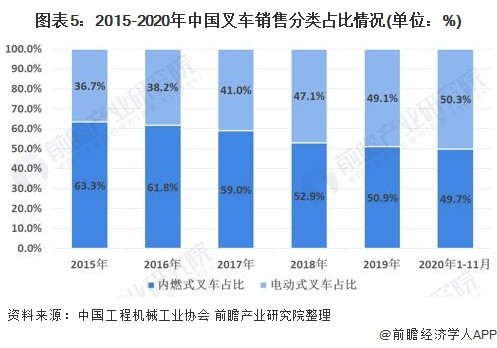 從2015-2020年中國(guó)叉車(chē)銷(xiāo)售分類占比情況來(lái)看,電動(dòng)式叉車(chē)的銷(xiāo)量占比逐年提升,從2015年的36.7%提升至2020年1-11月份的50.3%。主要是受到環(huán)保政策及室內(nèi)作業(yè)環(huán)境要求的驅(qū)動(dòng)作用,電動(dòng)叉車(chē)需求持續(xù)增長(zhǎng)。另外,根據(jù)中國(guó)工程機(jī)械工業(yè)協(xié)會(huì)資料顯示,在發(fā)達(dá)國(guó)家的叉車(chē)銷(xiāo)售結(jié)構(gòu)中電動(dòng)叉車(chē)占比均超60%,未來(lái)我國(guó)電動(dòng)叉車(chē)比例將持續(xù)提升。
