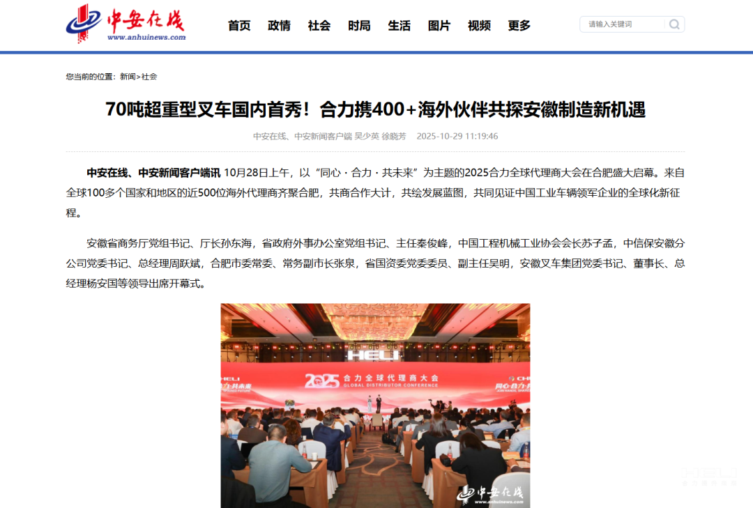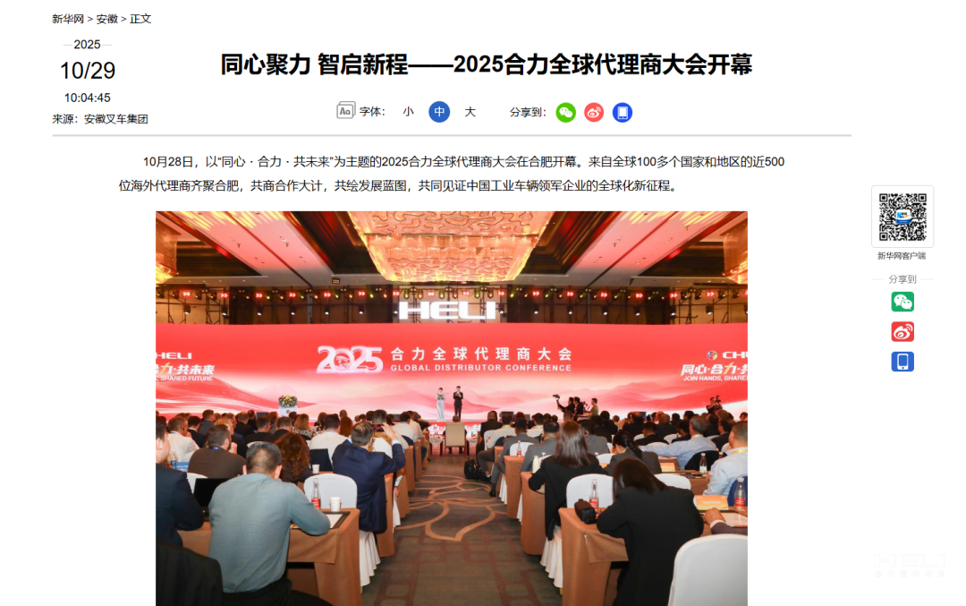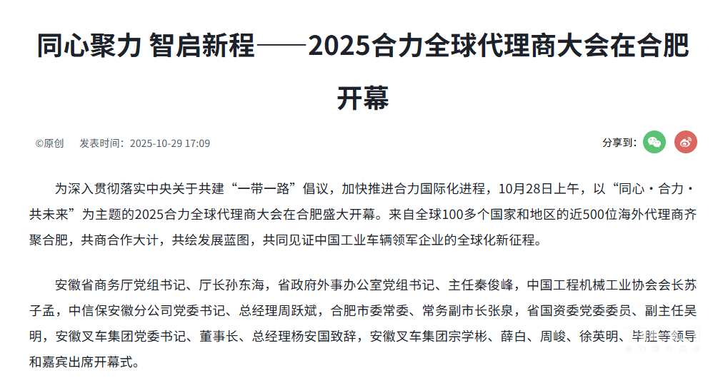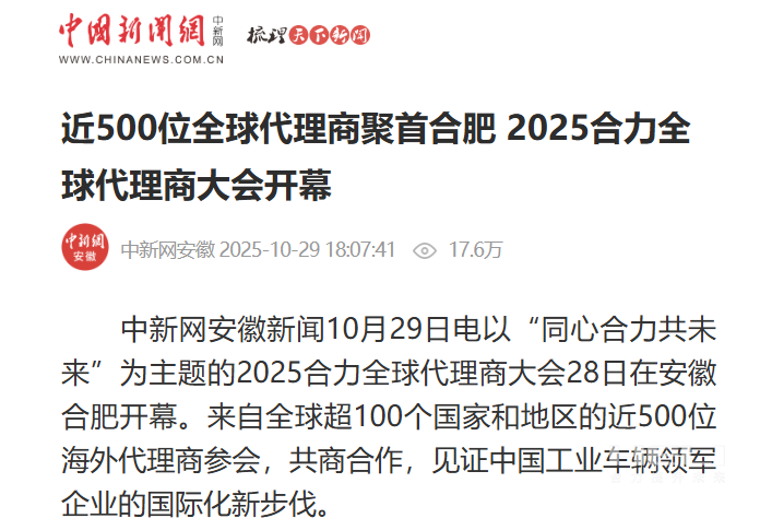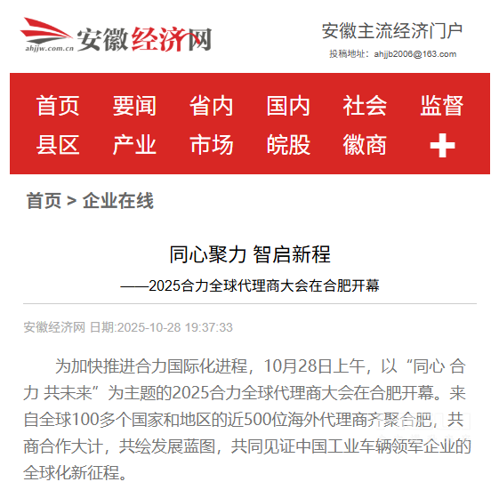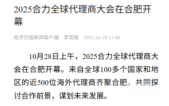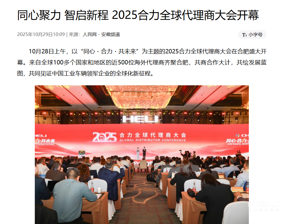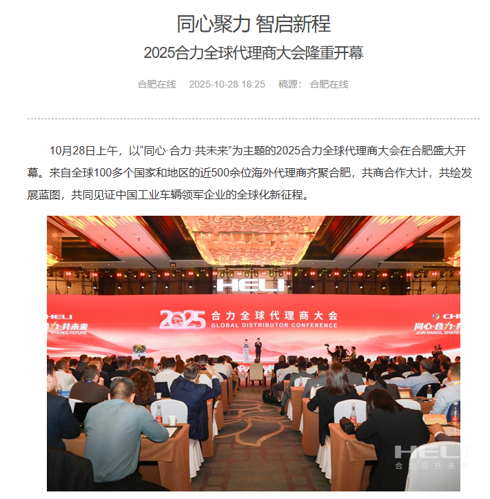 10月28日至31日,“同心?合力?共未來(lái)”2025合力全球代理商大會(huì)在合肥召開(kāi),引發(fā)媒體廣泛關(guān)注,新華社安徽分社、中央廣播電視臺(tái)安徽總站、經(jīng)濟(jì)日?qǐng)?bào)、證券日?qǐng)?bào)、央廣網(wǎng)、中國(guó)工業(yè)報(bào)、人民網(wǎng)安徽頻道、新華網(wǎng)安徽頻道、安徽日?qǐng)?bào)、安徽新聞聯(lián)播等28家媒體、46名記者蒞臨現(xiàn)場(chǎng)。中央、省內(nèi)外及香港、行業(yè)媒體競(jìng)相報(bào)道或轉(zhuǎn)載報(bào)道,內(nèi)容涵蓋戰(zhàn)略發(fā)布、智能成果及全球化布局,形式多元、視角鮮活,立體展現(xiàn)合力“智能+綠色”發(fā)展新動(dòng)能,奏響高質(zhì)量發(fā)展強(qiáng)音。