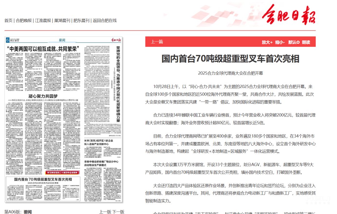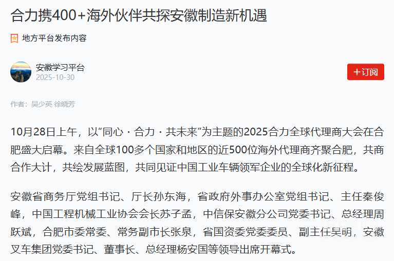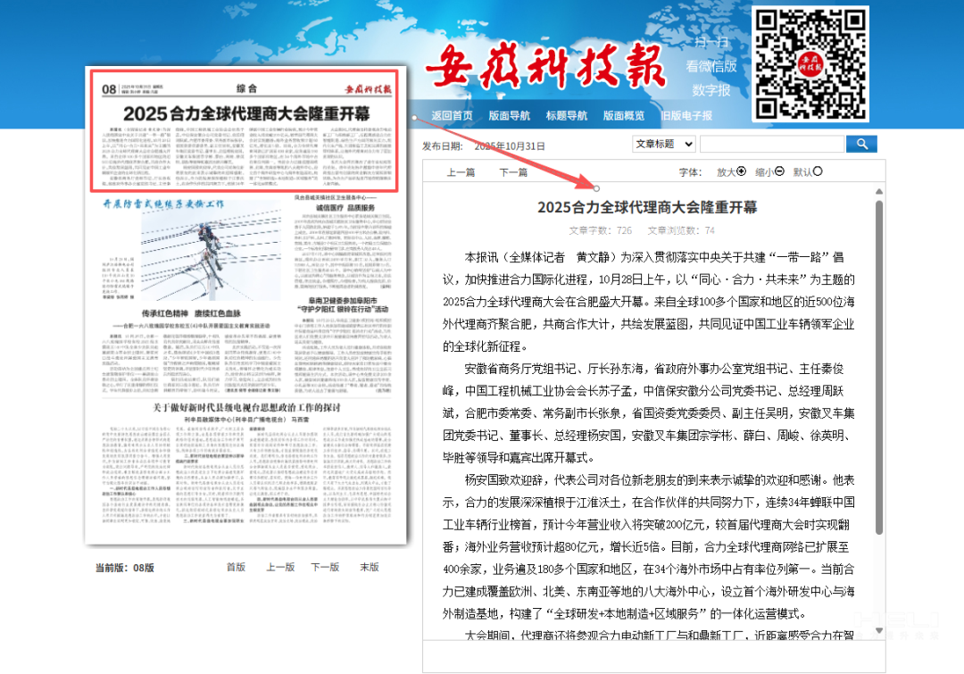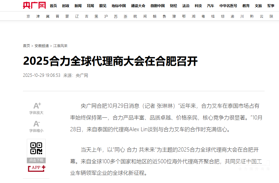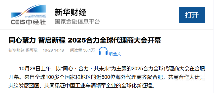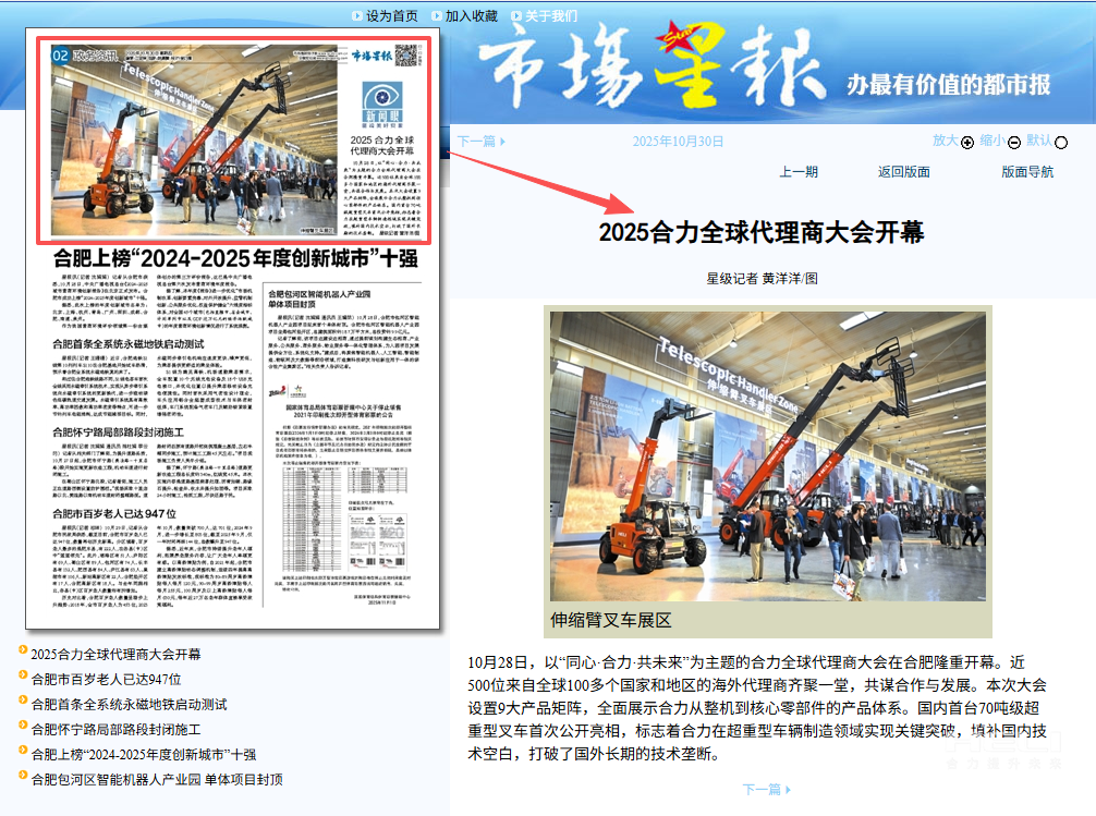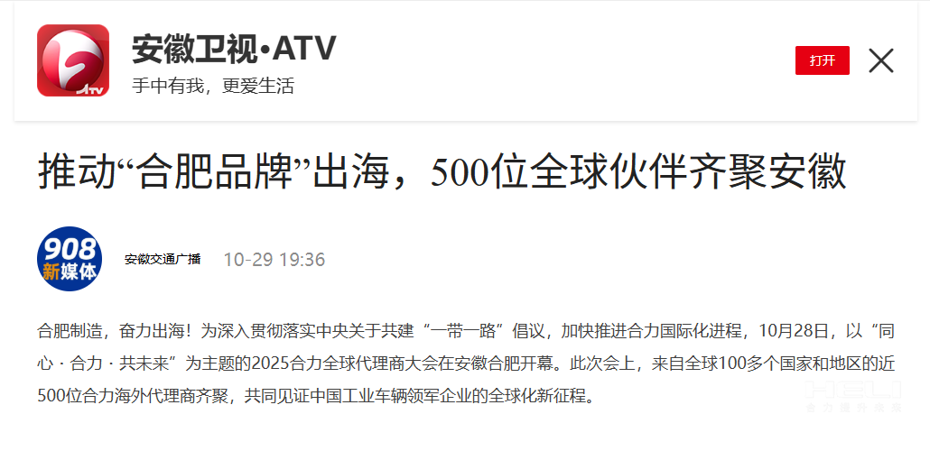10月28日至31日,“同心?合力?共未來(lái)”2025合力全球代理商大會(huì)在合肥召開(kāi),引發(fā)媒體廣泛關(guān)注,新華社安徽分社、中央廣播電視臺(tái)安徽總站、經(jīng)濟(jì)日?qǐng)?bào)、證券日?qǐng)?bào)、央廣網(wǎng)、中國(guó)工業(yè)報(bào)、人民網(wǎng)安徽頻道、新華網(wǎng)安徽頻道、安徽日?qǐng)?bào)、安徽新聞聯(lián)播等28家媒體、46名記者蒞臨現(xiàn)場(chǎng)。中央、省內(nèi)外及香港、行業(yè)媒體競(jìng)相報(bào)道或轉(zhuǎn)載報(bào)道,內(nèi)容涵蓋戰(zhàn)略發(fā)布、智能成果及全球化布局,形式多元、視角鮮活,立體展現(xiàn)合力“智能+綠色”發(fā)展新動(dòng)能,奏響高質(zhì)量發(fā)展強(qiáng)音。