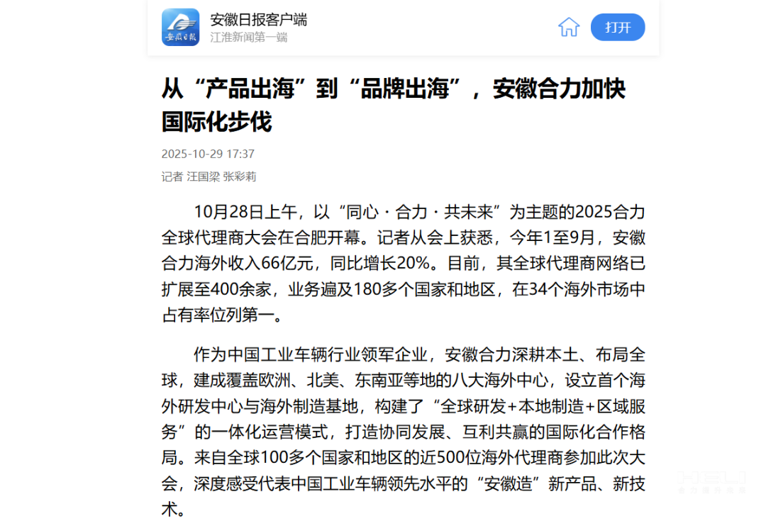 安徽日?qǐng)?bào)客戶端丨從“產(chǎn)品出海”到“品牌出海”,安徽合力加快國(guó)際化步伐