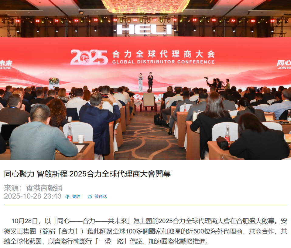 10月28日上午,以“同心·合力·共未來(lái)”為主題的2025合力全球代理商大會(huì)在合肥開(kāi)幕。來(lái)自全球100多個(gè)國(guó)家和地區(qū)的近500位海外代理商齊聚一堂,共商合作大計(jì),共繪發(fā)展藍(lán)圖。此次大會(huì)是安徽叉車集團(tuán)落實(shí)共建“一帶一路”倡議、加快國(guó)際化進(jìn)程的重要舉措。